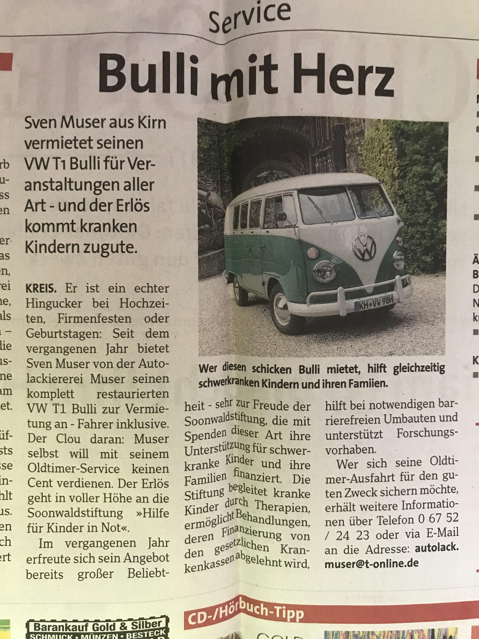 Suchen Sie für Ihre Hochzeit, Ihre Firmenveranstaltung oder einen anderen besondern Anlass einen perfekt restaurierten Oldtimer VW-Bulli T1 von 1967 inklusive Fahrer? Zu Gunsten der Soonwaldstiftung „Hilfe für Kinder in Not“ können Sie den Bulli mit Fahrer mieten. Der Erlös geht zu 100 % an die Stiftung, die schwerkranke Kinder und ihre Familien unterstützt. Anfragen bitte direkt an Sven Muser.